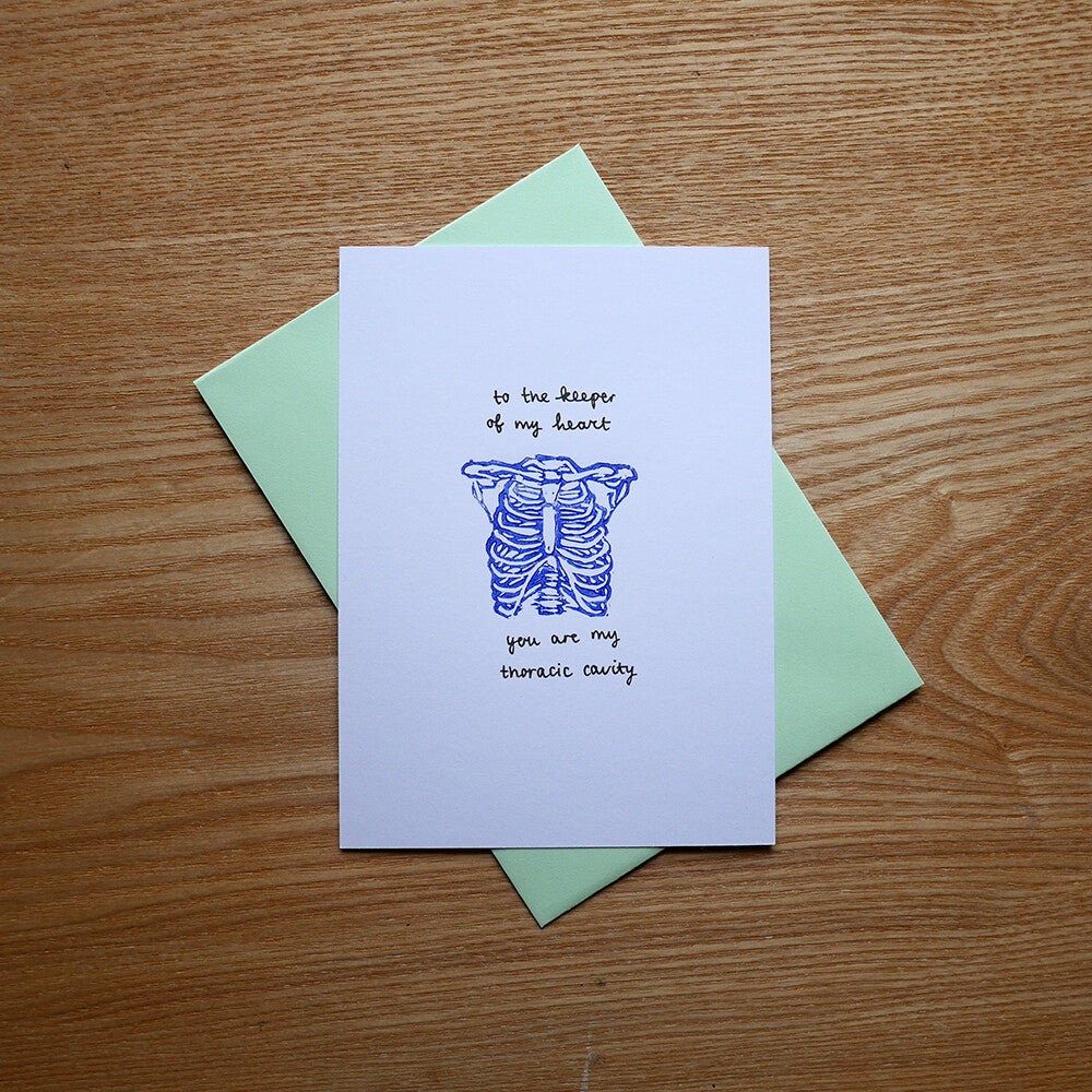 To the keeper of my heart, you are my thoracic cavity. Een handgedrukte en handgeschreven wenskaart (A6 formaat) met medische pun.
