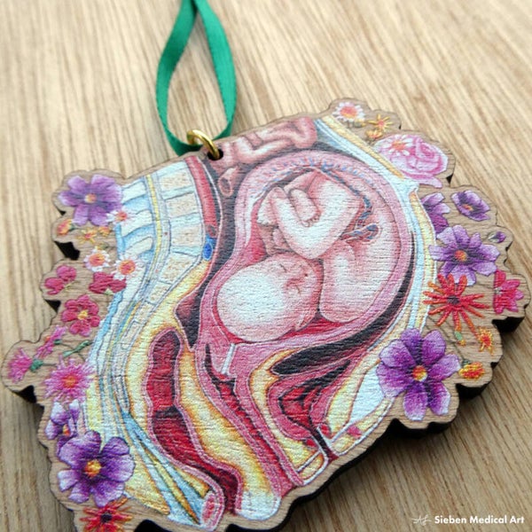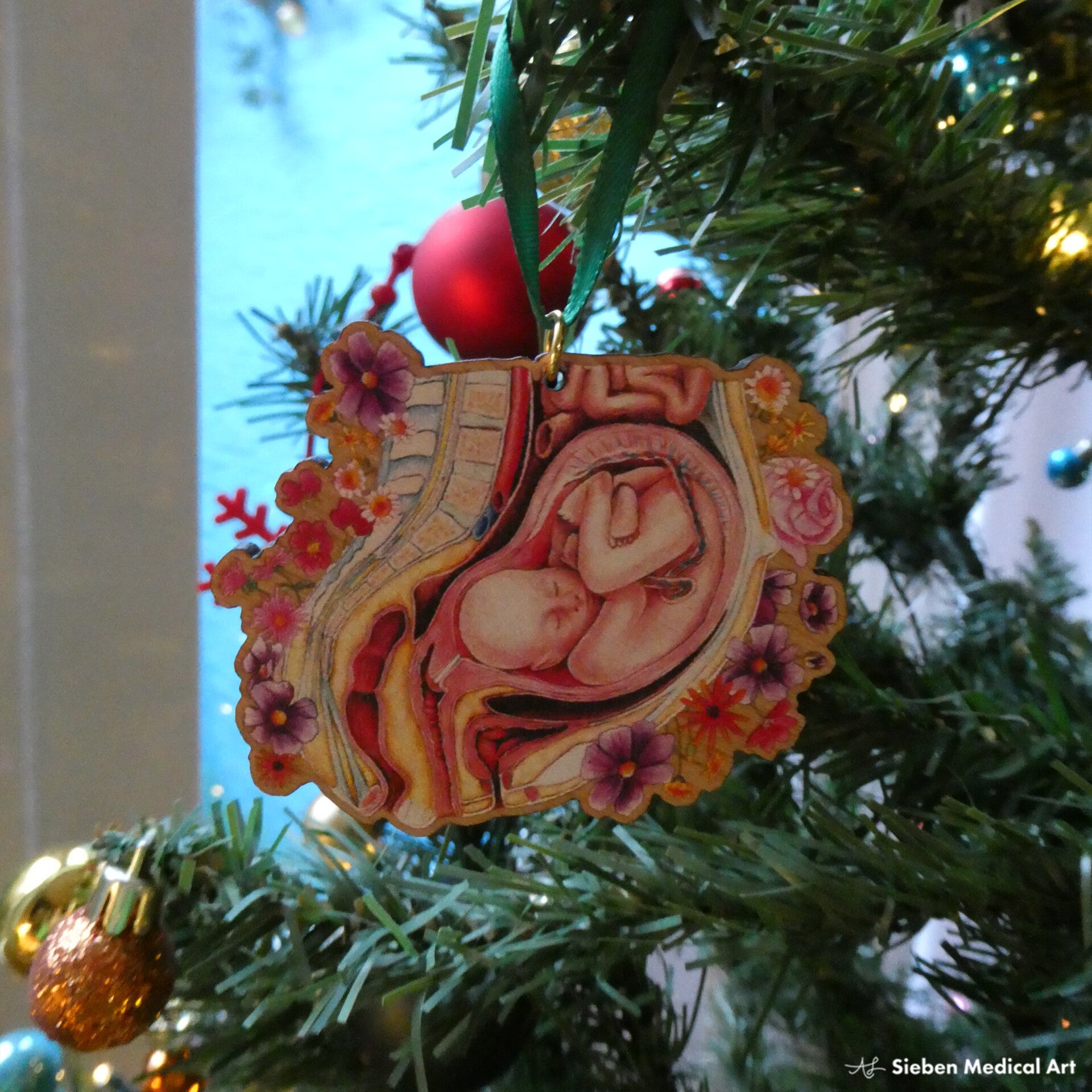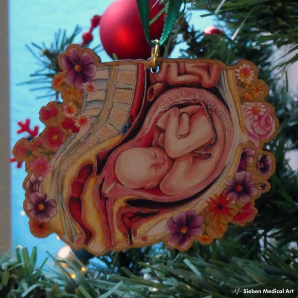 Versier je kerstboom met deze houten hanger met daarop een doorsnede van het abdomen, inclusief foetus in de baarmoeder! Ook leuk als kerst cadeau aan een zwangere, geneeskunde student, biologie enthousiast of arts (in opleiding). Dit ornament is gemaakt van een van mijn originele illustraties.