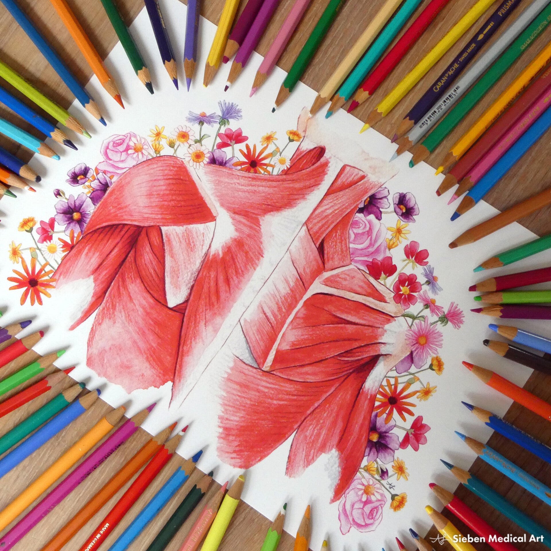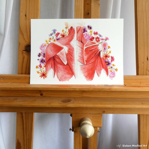 Deze A4 art print is een hoogwaardige print van een mixed media kunstwerk (aquarel en kleurpotlood), dat spieren van de menselijke bovenrug laat zien, omringd door bloemen.