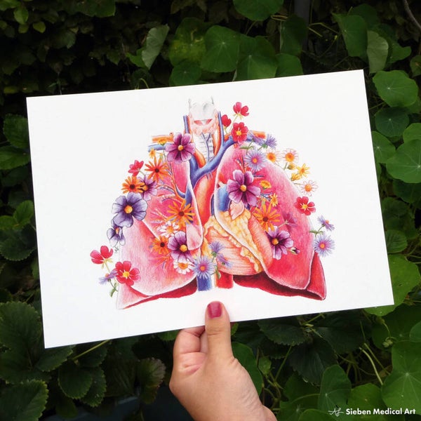 Deze A4 art print is een hoogwaardige print van een mixed media kunstwerk (aquarel en kleurpotlood), dat onder andere hart en longen laat zien, omringd door bloemen.