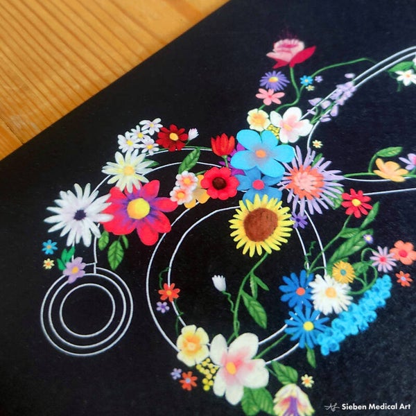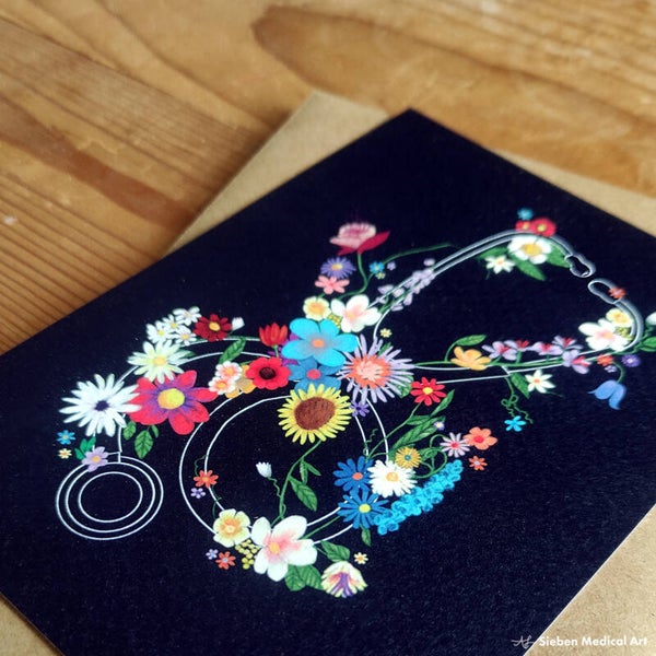De illustratie op de kaart is een mix van een lijntekening van een stethoscoop en digitaa lgetekende bloemen. De kaart zelf is gemaakt van 250 grams tintoretto gesso papier papier, wat een lichte structuur heeft, wat een beetje lijkt op aquarelpapier. De achterkant van de kaart is beschrijfbaar. Deze medische wenskaart wordt geleverd met een envelop.