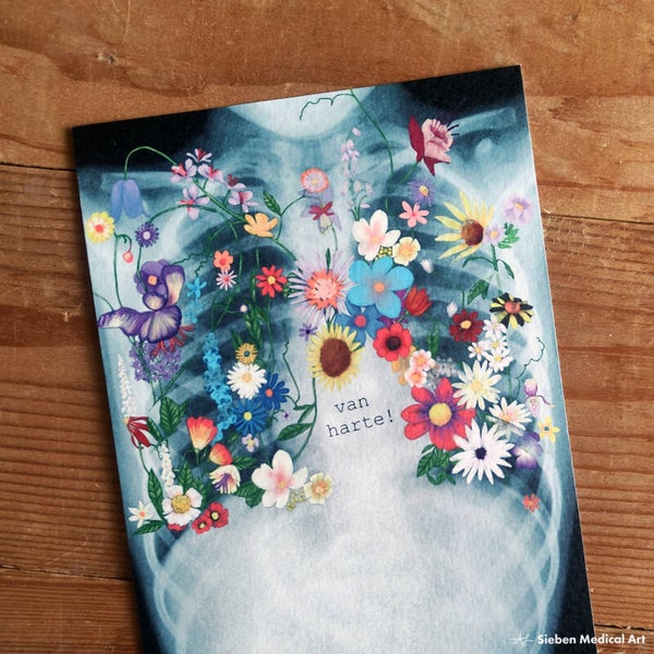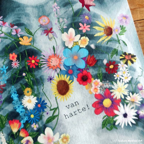 De illustratie op de kaart is een mix van een publiek domein röntgen foto en handgetekende bloemen. De kaart zelf is gemaakt van 250 grams tintoretto gesso papier papier, wat een lichte structuur heeft, wat een beetje lijkt op aquarelpapier. De achterkant van de kaart is beschrijfbaar. Deze medische wenskaart wordt geleverd met een envelop.